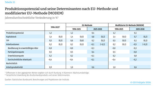 Recently in Germany, the Joint Economic Forecast Project Group — comprising many of Germany’s most renowned economic research institutes — published a medium-term forecast for productive potential. According to their calculations, growth in total factor productivity in Germany, which measures these productivity advances at the macroeconomic level, is set to remain only marginally above zero percent in the coming years. This should not primarily be interpreted as a prediction of what will actually happen. The methods underlying these calculations are unreliable in times of structural upheaval and are influenced by current phases of stagnation or labor hoarding. Future productivity gains — from artificial intelligence, for example — cannot be predicted by such methods in any case. Nevertheless, these calculations are worrying. If Germany succeeds in achieving higher total factor productivity growth through greater innovation and structural reforms, this could partially or fully offset the projected decline in the volume of work. The consequences of an ageing population could thus also be cushioned.
